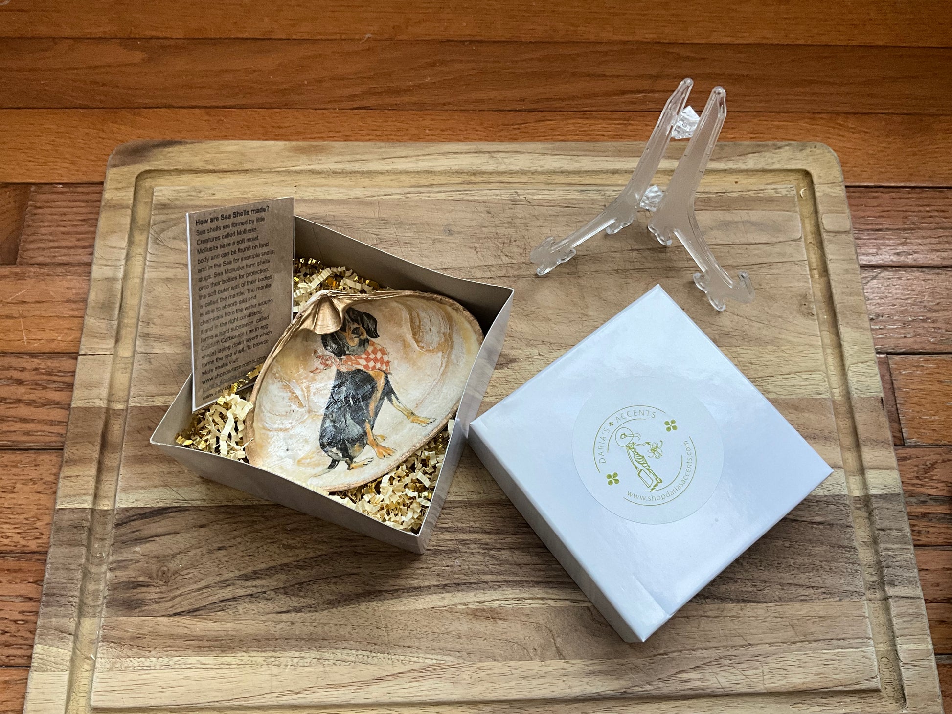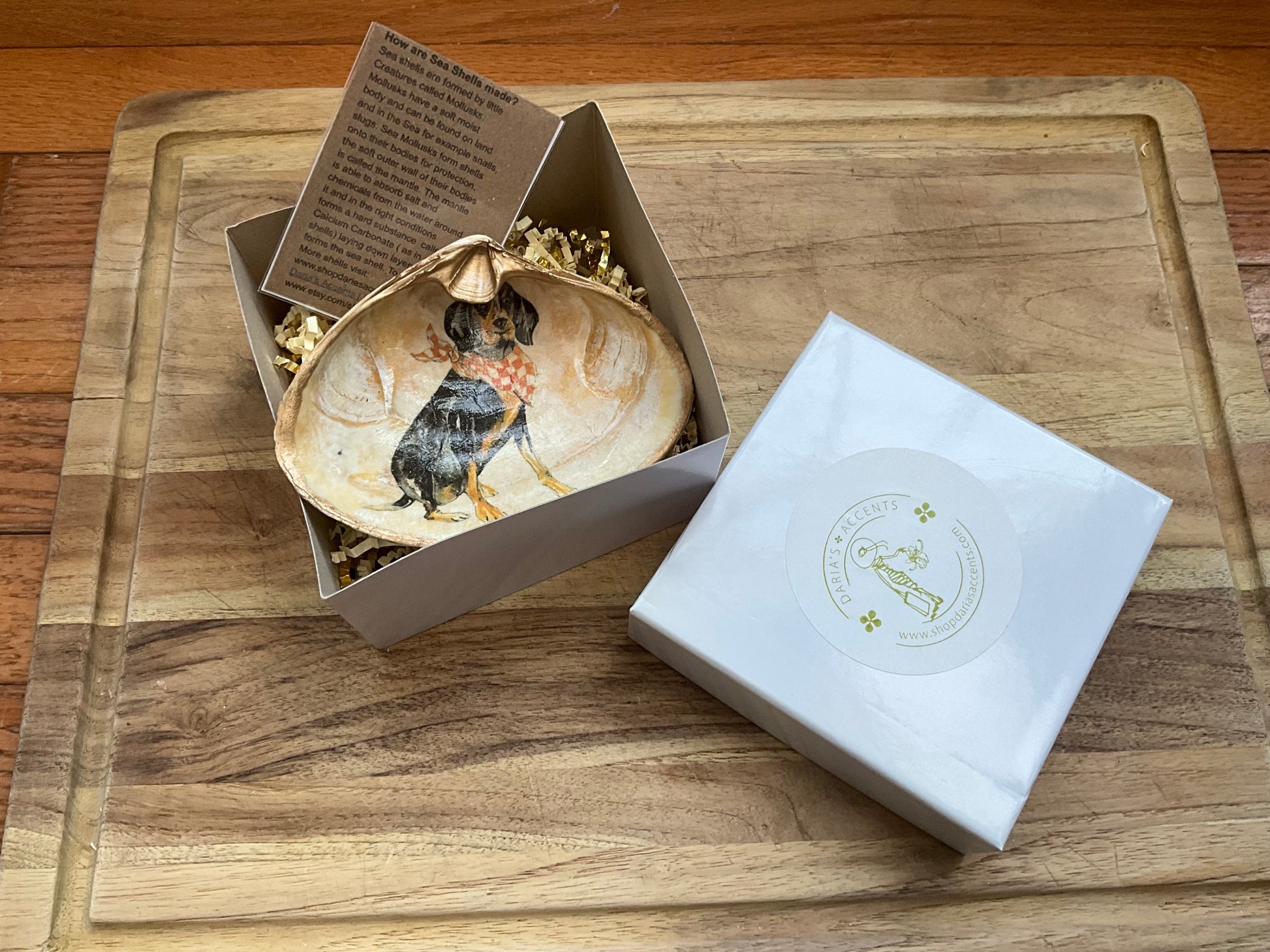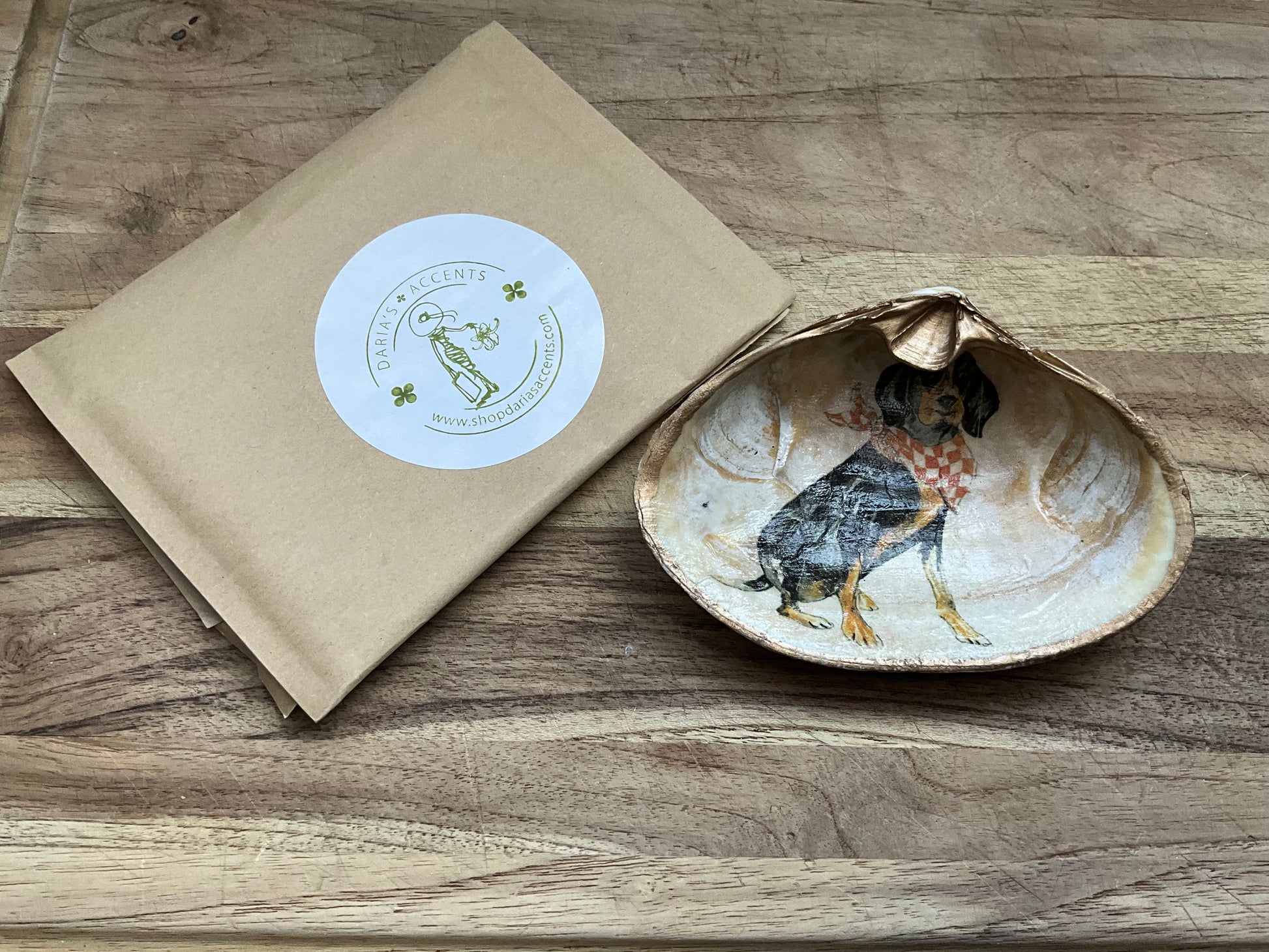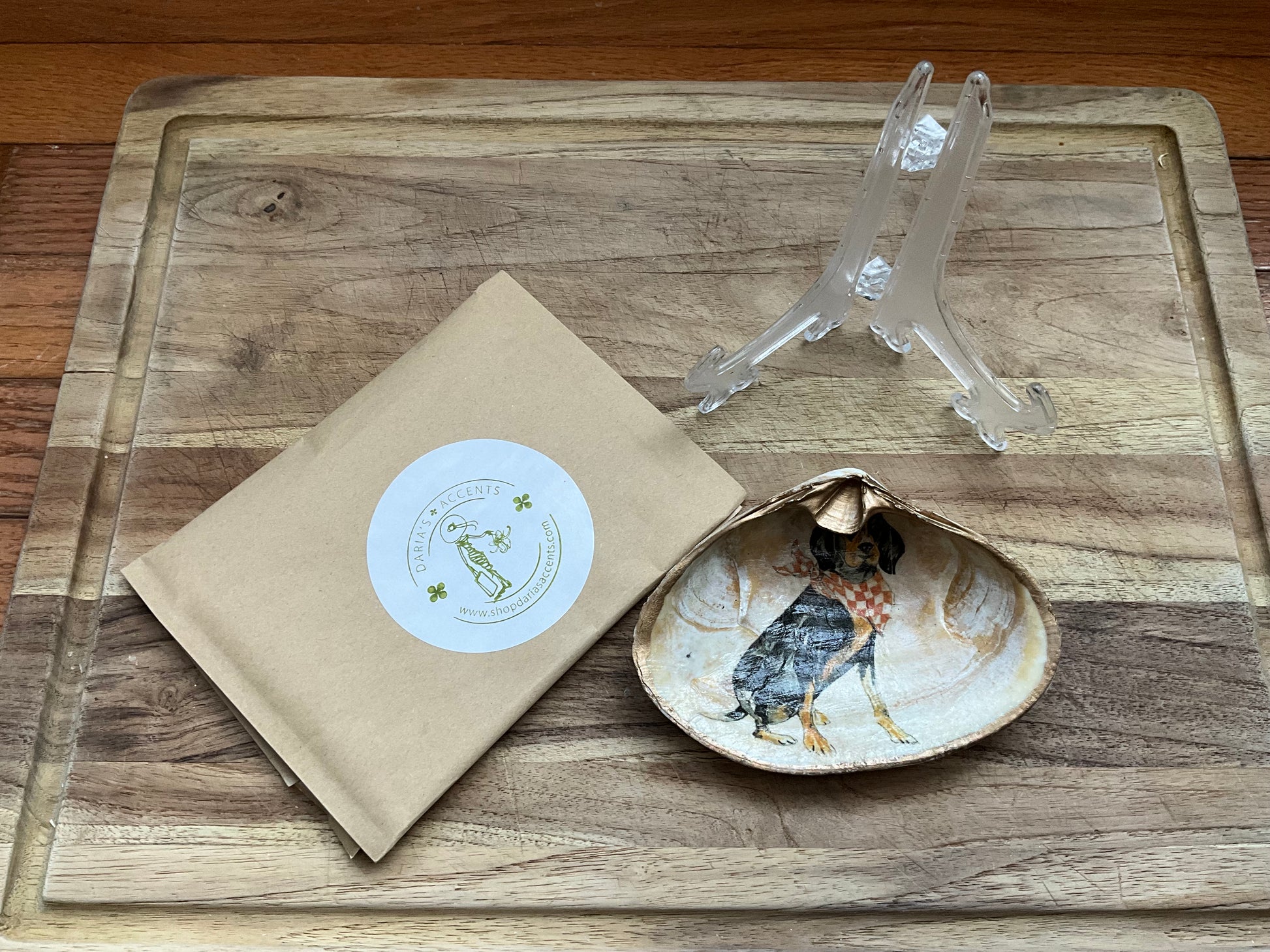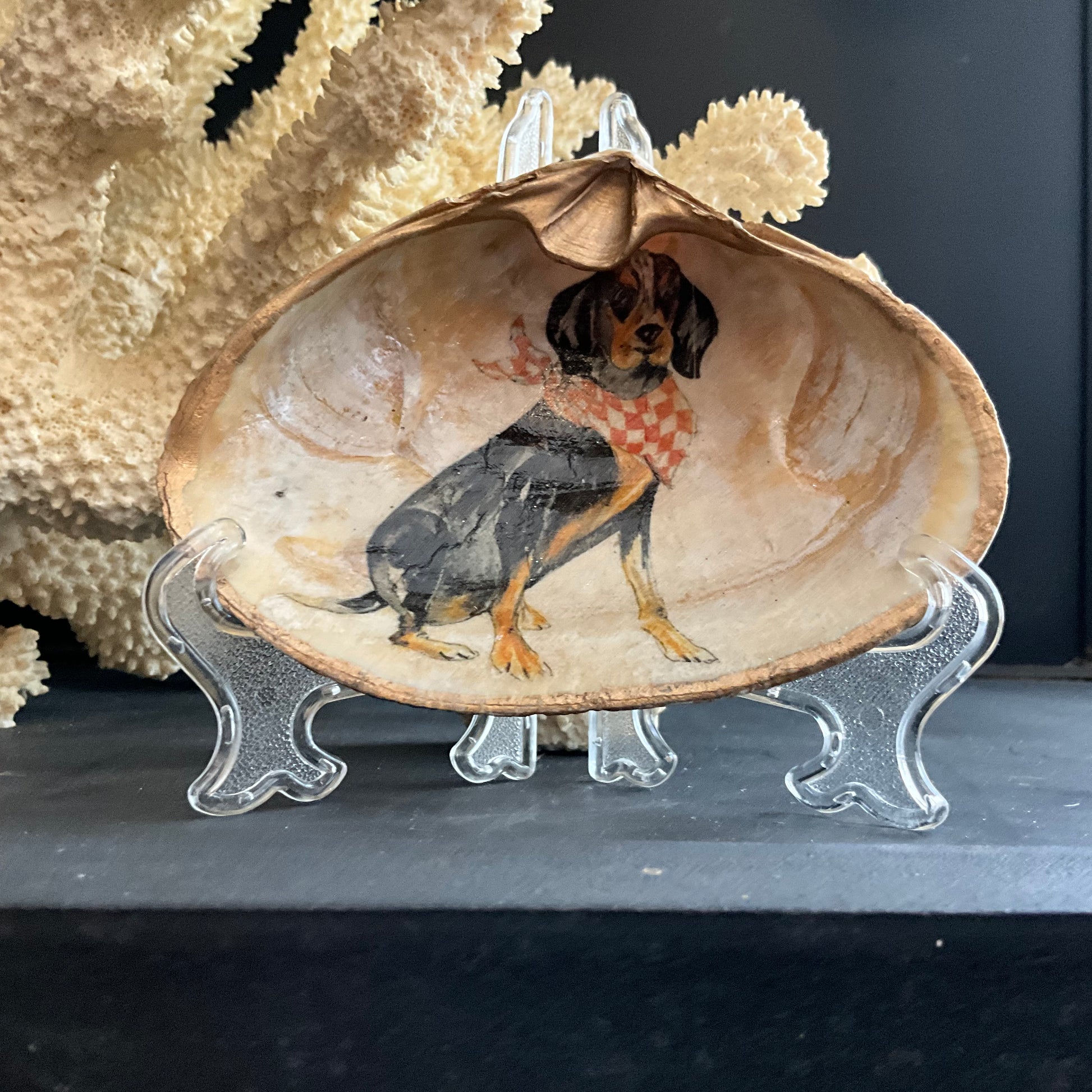 Black and tan Coon Dog with checkered orange and white bandana. Consider gift box and stand for additional charges. Shell sizes and coloring slightly vary. Found on the beaches of New Jersey. Offering free personalization. Packaged with description card which explains, how clam shells are formed in the ocean.