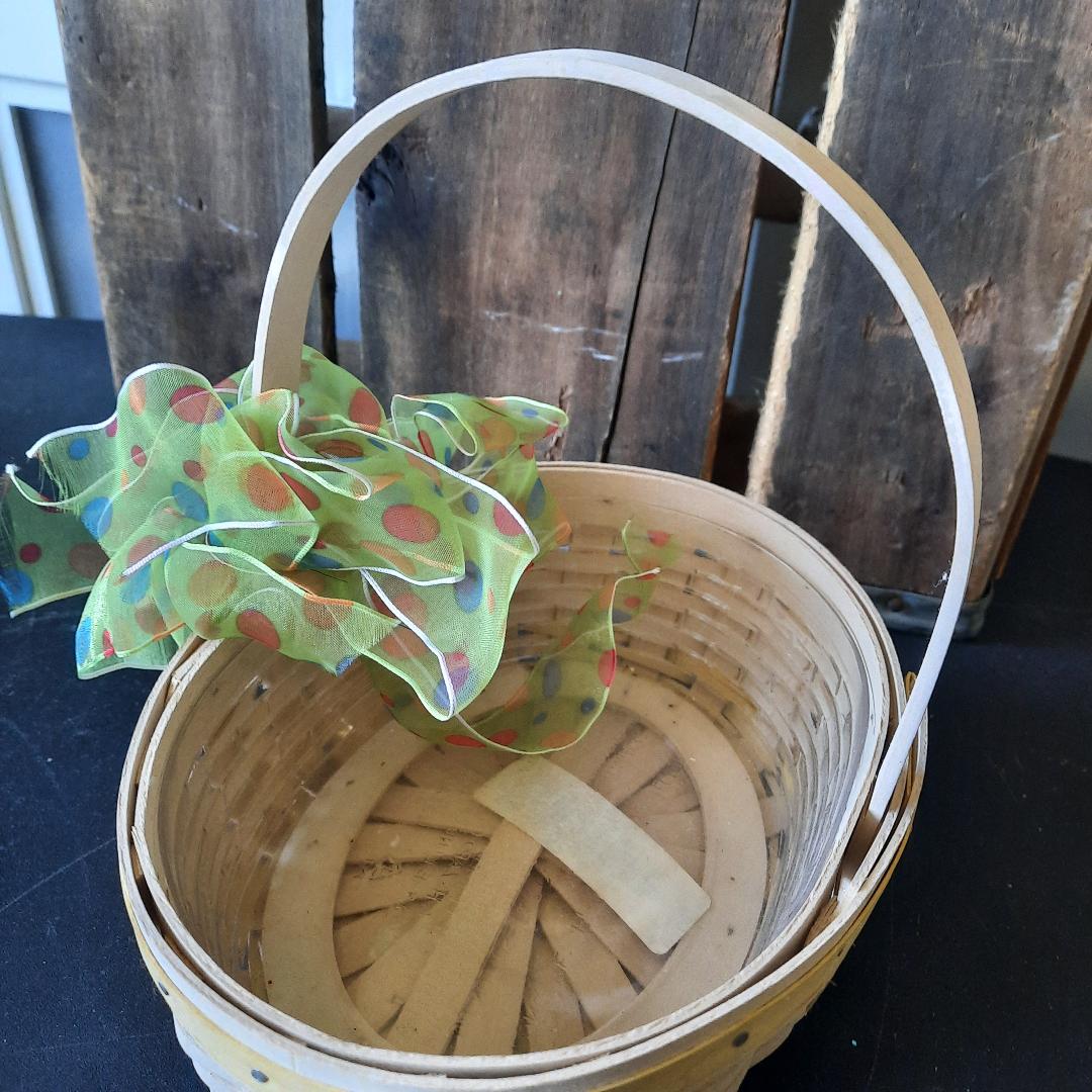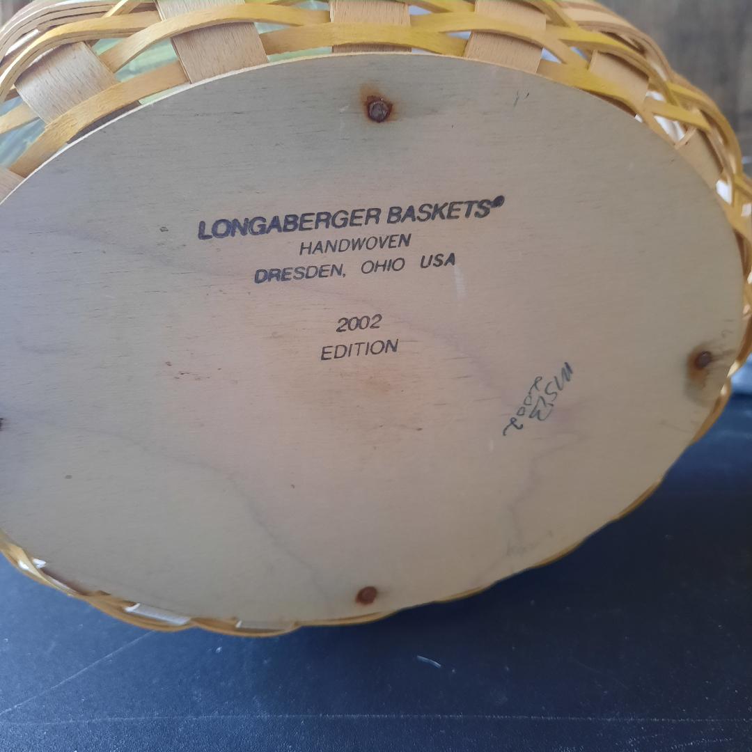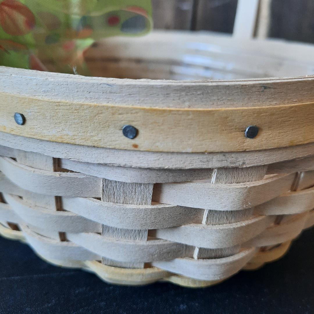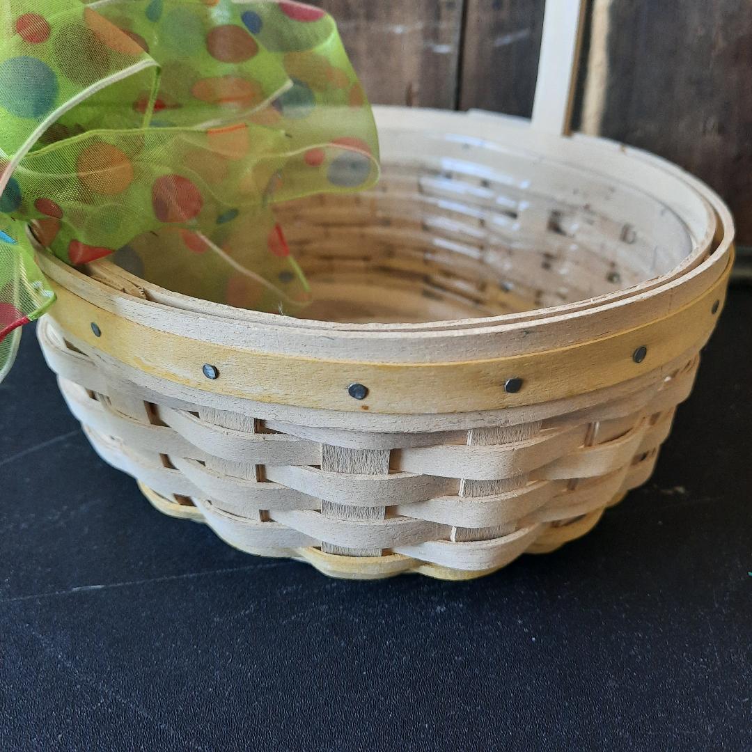 Pre owned signed wood woven Longaberger small basket. Easter white pale Yellow wood trim top rim of basket. Pale yellow woven trim bottom of the basket. 2002 edition. Plastic liner inside basket. Small weaving. Excellent condition. Basket measurements: 3 inches high (not including handle) 22 inches around basket. 5 .5 inches wide. The handle is 13 inches from one end to the other end of the basket. The handle is not moveable.