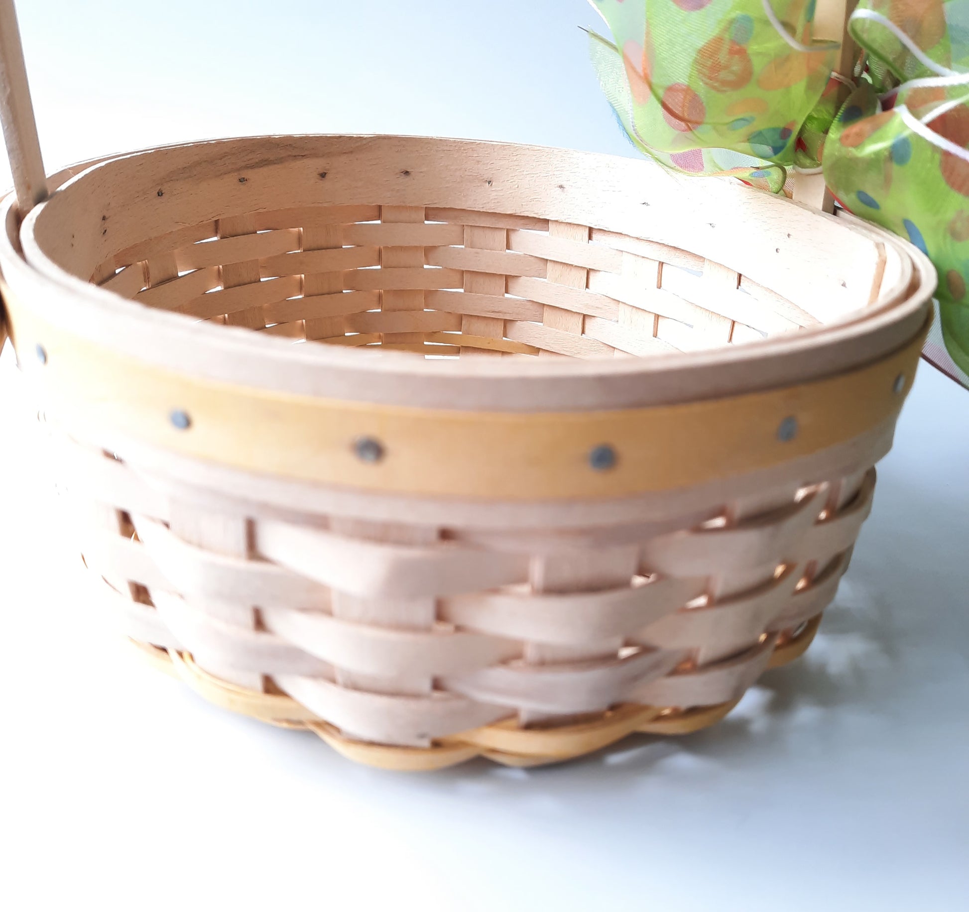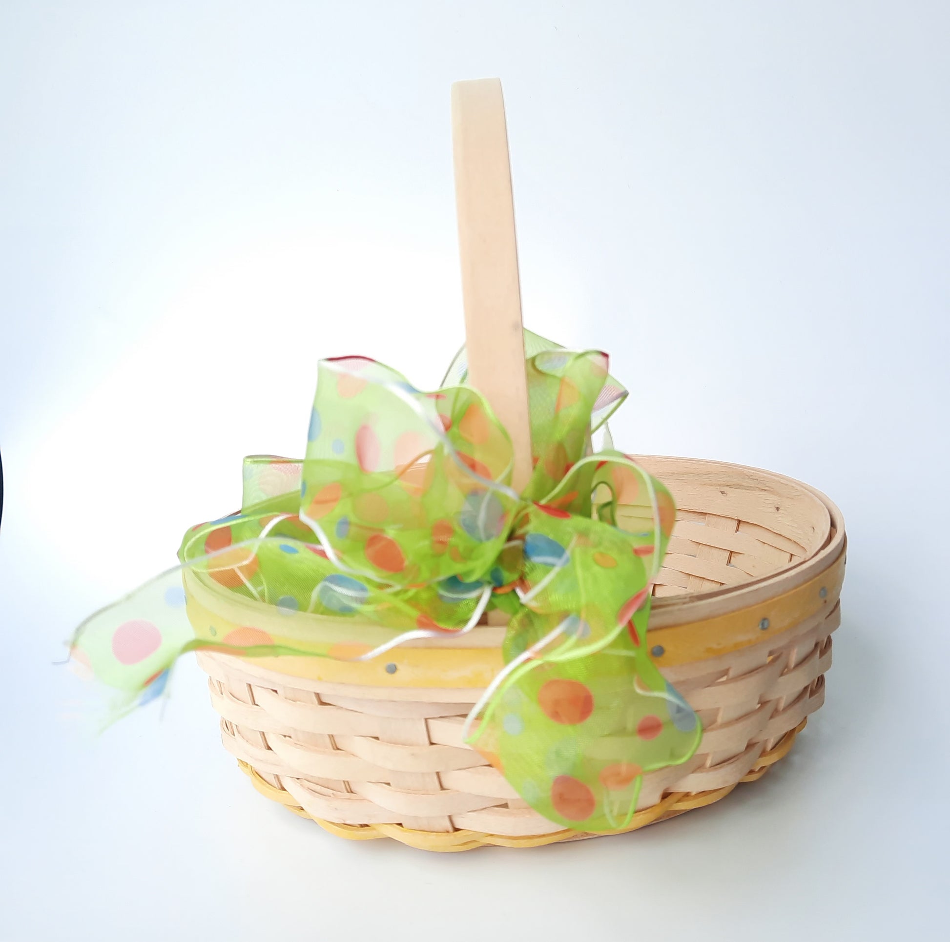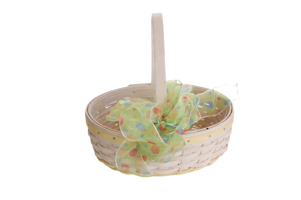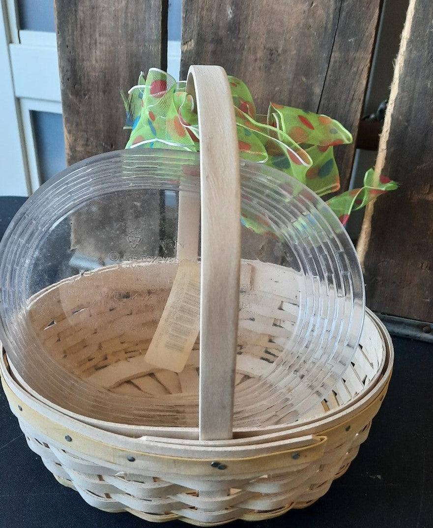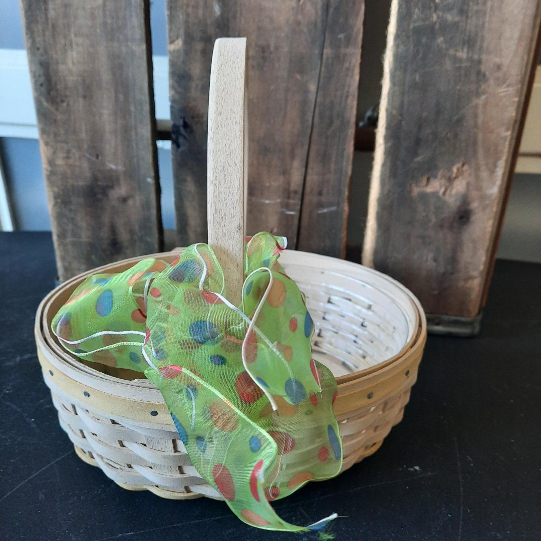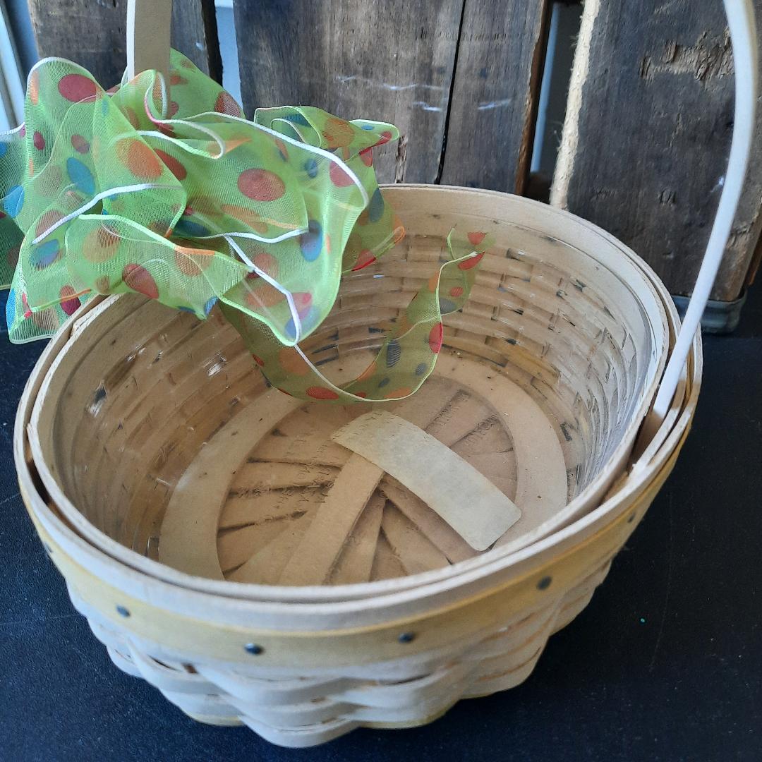 Pre owned signed wood woven Longaberger small basket. Easter white pale Yellow wood trim top rim of basket. Pale yellow woven trim bottom of the basket. 2002 edition. Plastic liner inside basket. Small weaving. Excellent condition. Basket measurements: 3 inches high (not including handle) 22 inches around basket. 5 .5 inches wide. The handle is 13 inches from one end to the other end of the basket. The handle is not moveable.