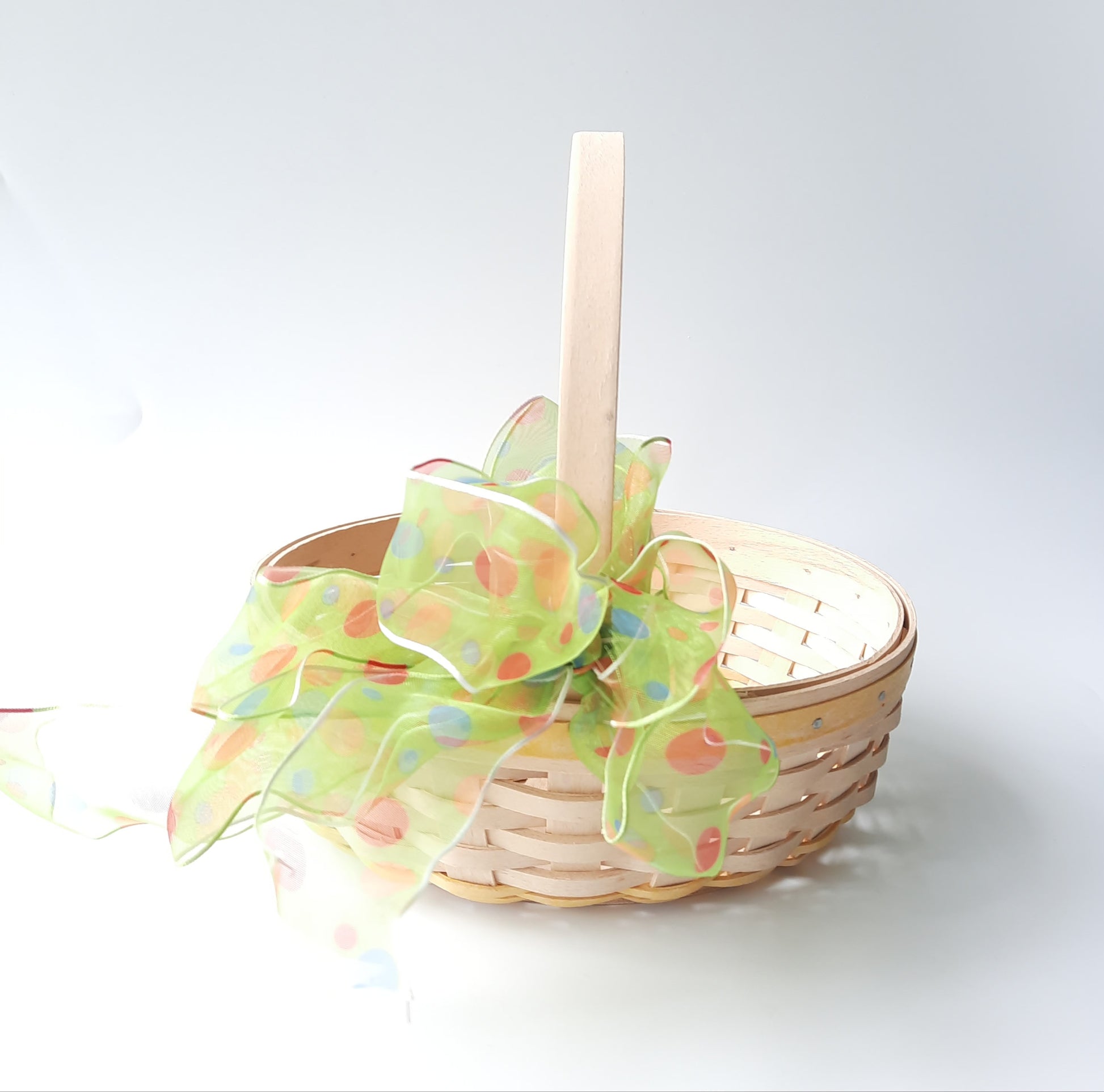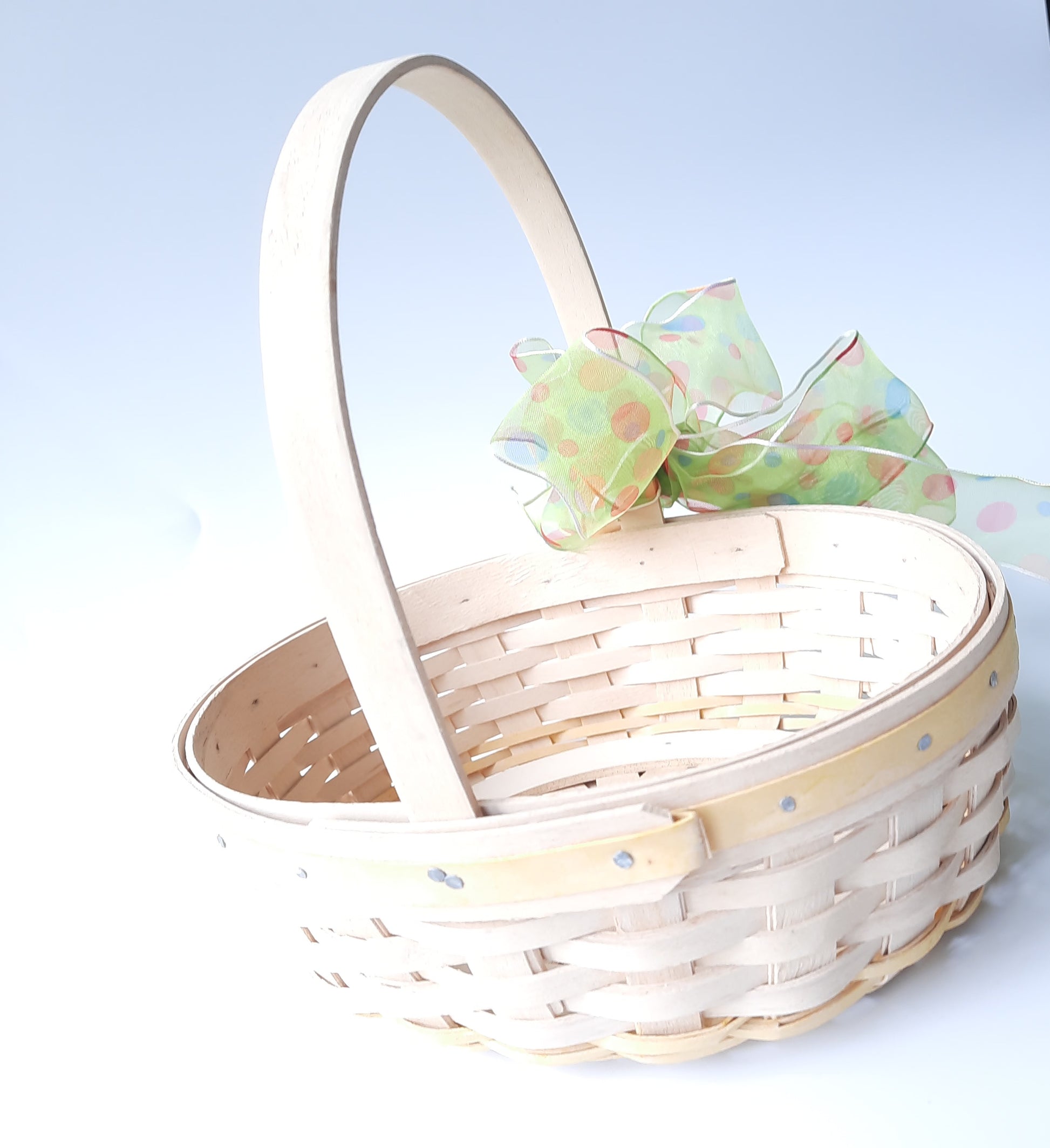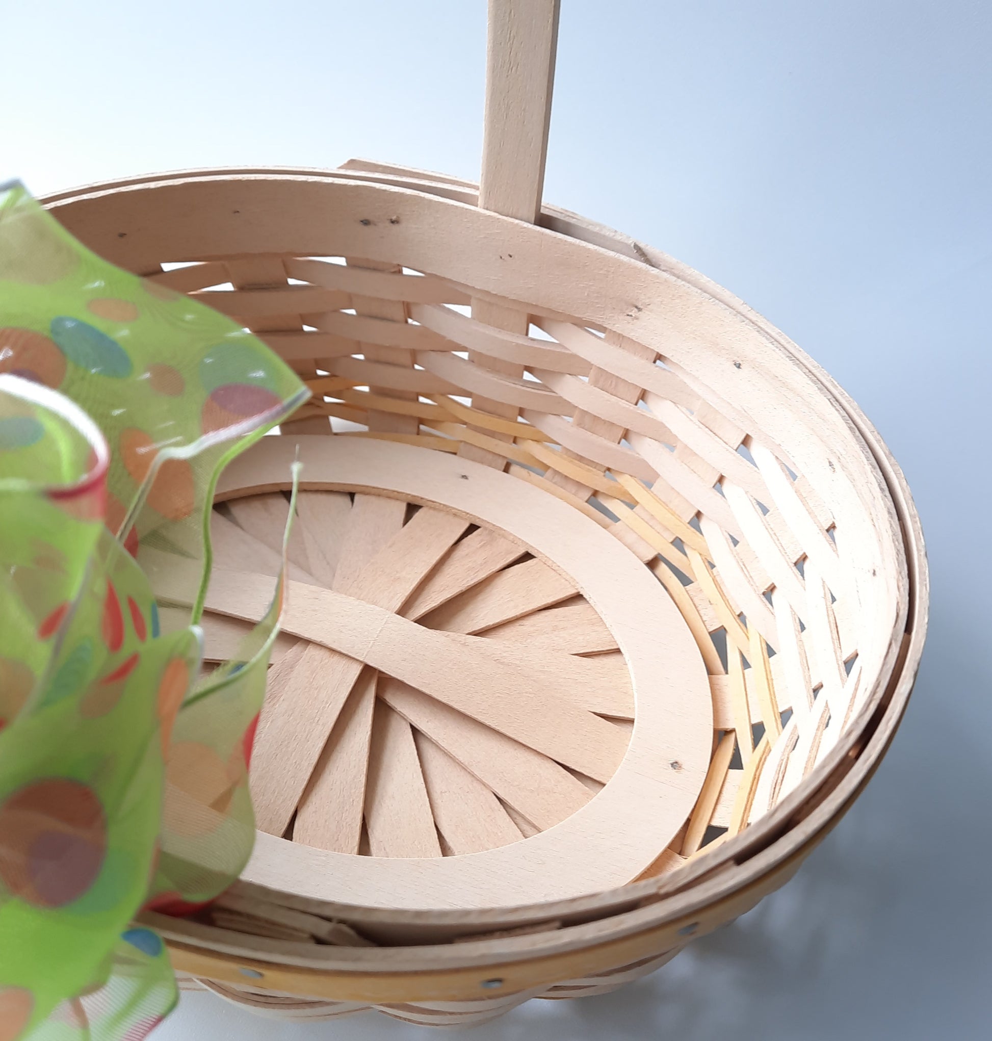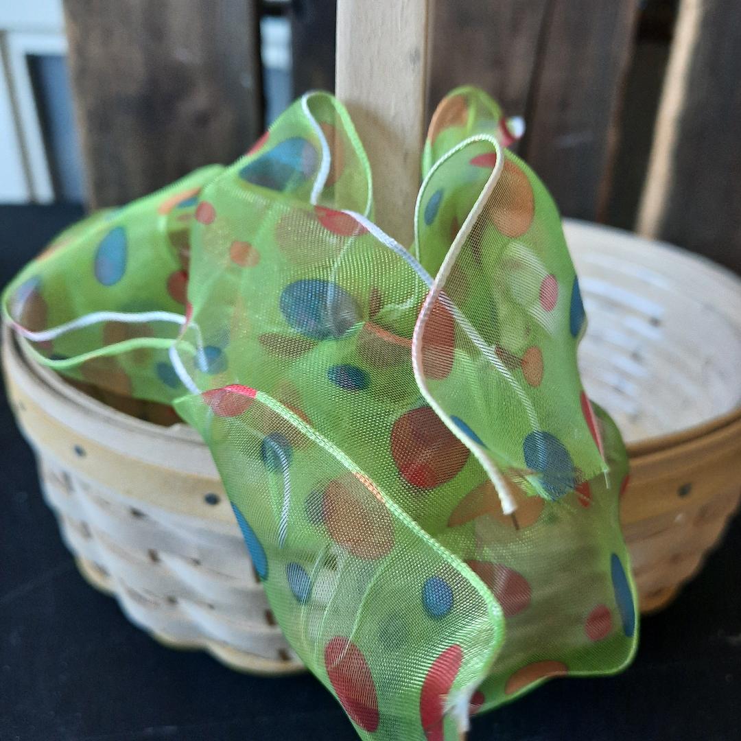 Pre owned signed wood woven Longaberger small basket. Easter white pale Yellow wood trim top rim of basket. Pale yellow woven trim bottom of the basket. 2002 edition. Plastic liner inside basket. Small weaving. Excellent condition. Basket measurements: 3 inches high (not including handle) 22 inches around basket. 5 .5 inches wide. The handle is 13 inches from one end to the other end of the basket. The handle is not moveable.