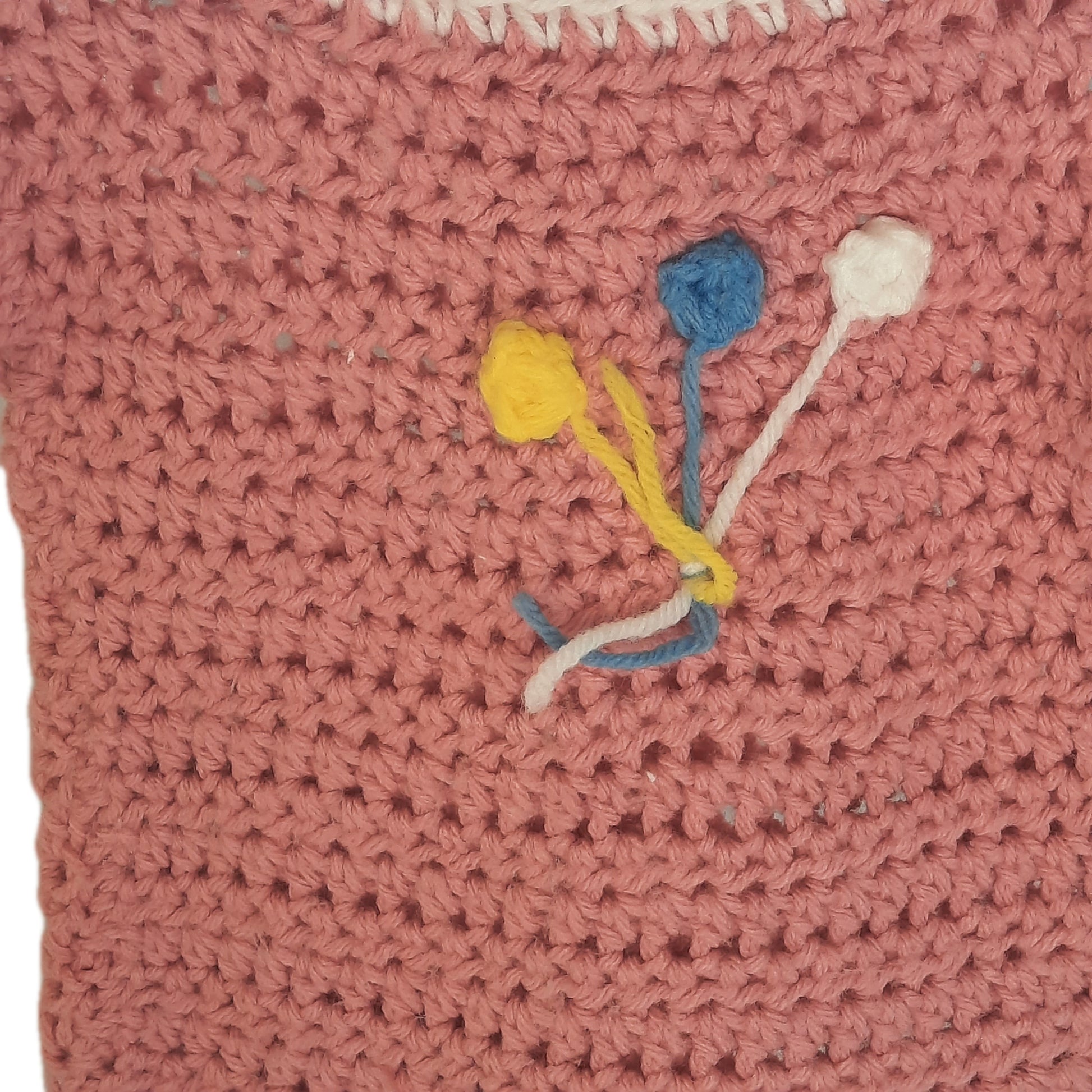Beautiful hand knit cap sleeve sweater. 24mo. Hand knit white trim around the collar, ends of sleeves, and bottom of the sweater. Three hand knit raised balloons (yellow, blue, white).on the front of the sweater. Hand wash.