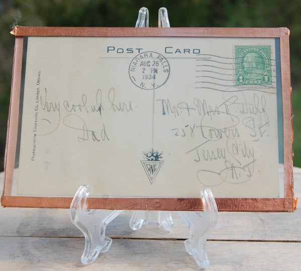 Vintage post card sent from Niagra Falls Aug 28, 1934. to Jersey City NJ. The front of the post card reads "The Princess" Gates. Eastern Entrance to Canadian National Exhibition.  4 x 6 glass frame trimmed with copper foil tape. Comes with acrylic easel which measures 5in tall and 5 in wide when completely open.