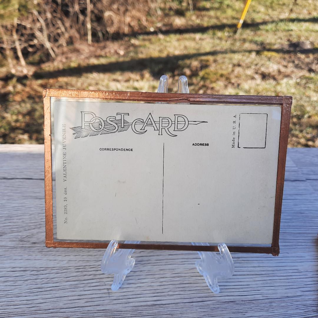 This Valentine postcard is in a 4 x 6 glass frame trimmed with copper foil trim. Comes with an acrylic stand that measures 5in tall and 5 in wide when fully open.