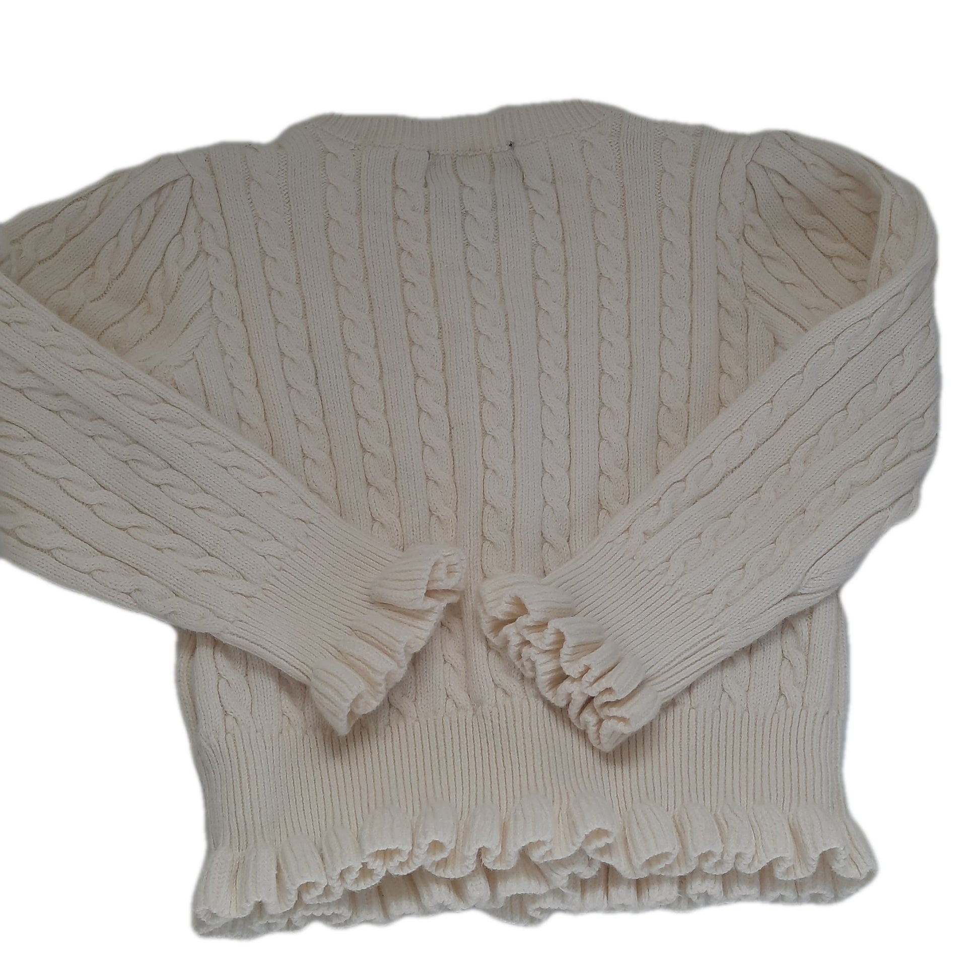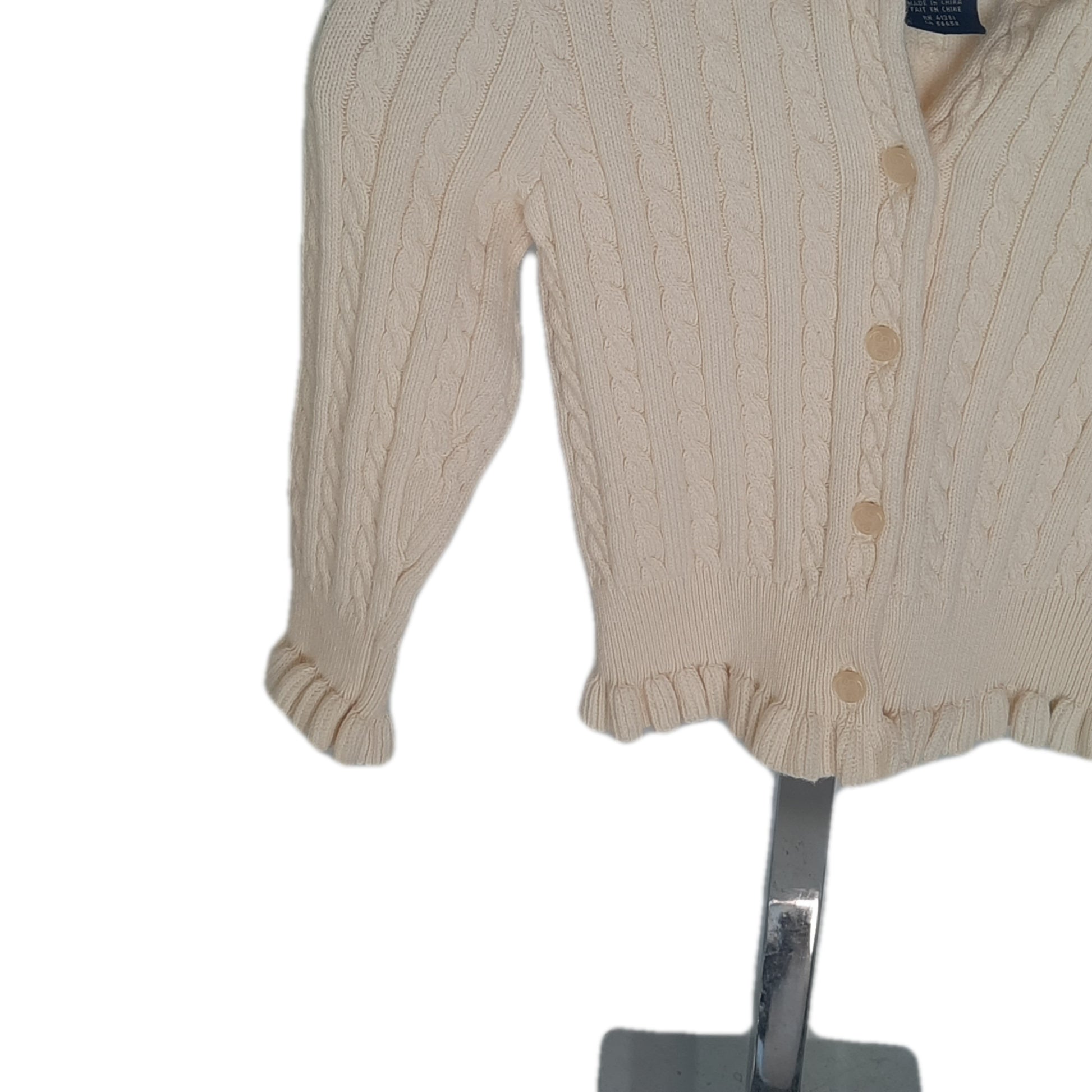 Beautiful pre owned "Ralph Lauren" button down sweater. 100% cotton. Mint condition like new. Off white baby size 18 mo. 5 buttons in the front of the sweater. Each button is off white color and each measures a little over a 1/4 in. each. "Ralph Lauren" logo on upper left side of the sweater. Knit ruffles on the ends of each sleeve and bottom of the sweater. Machine wash cold gentle cycle.