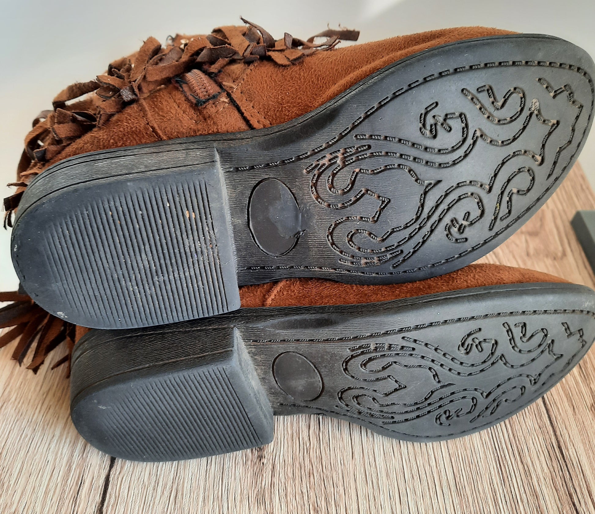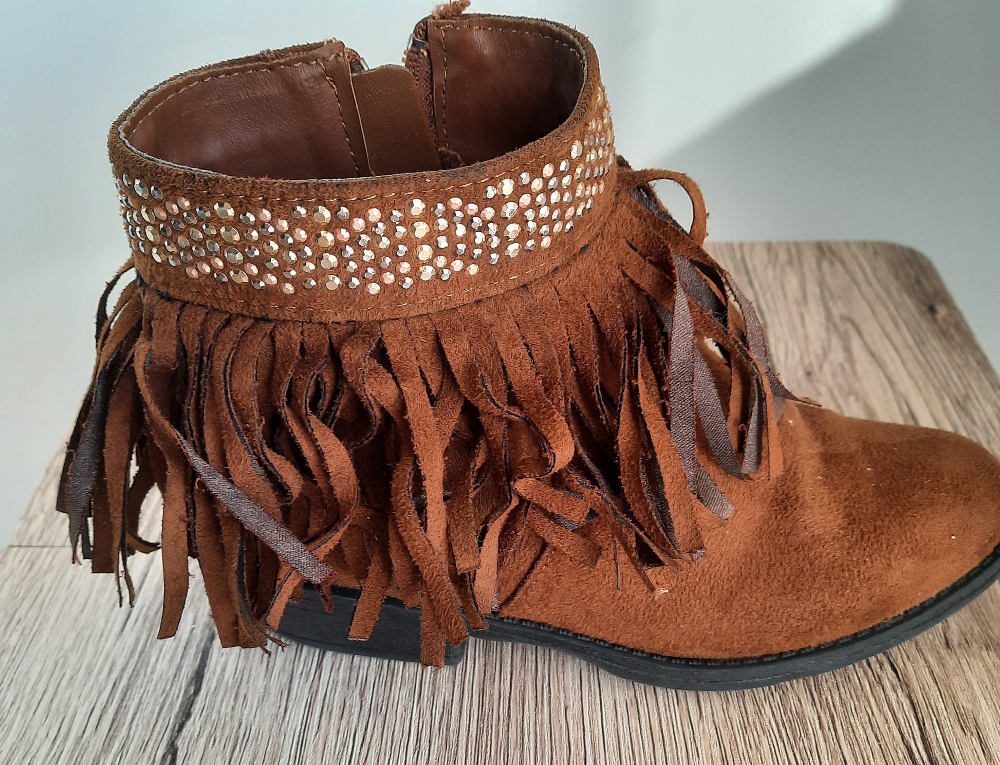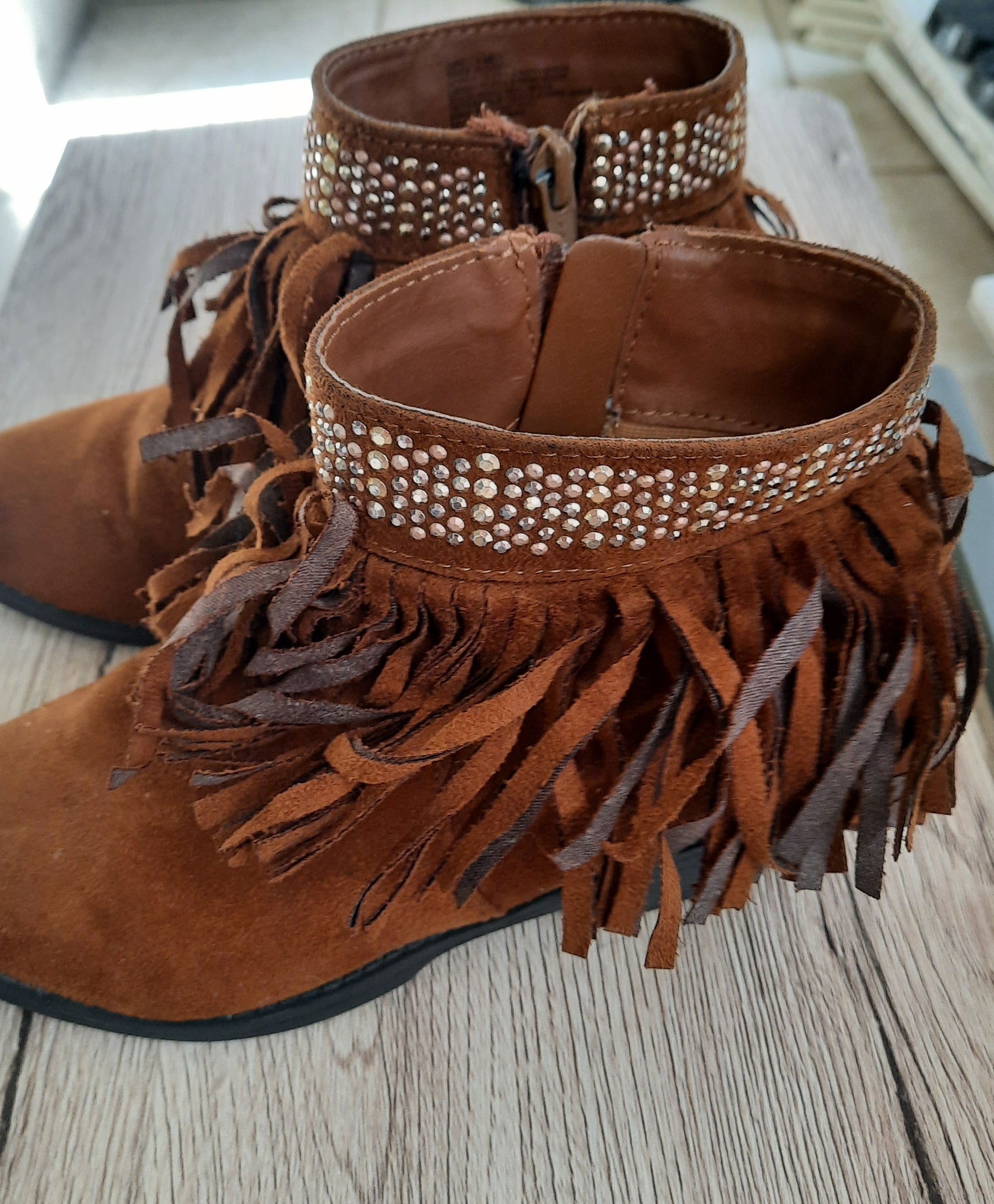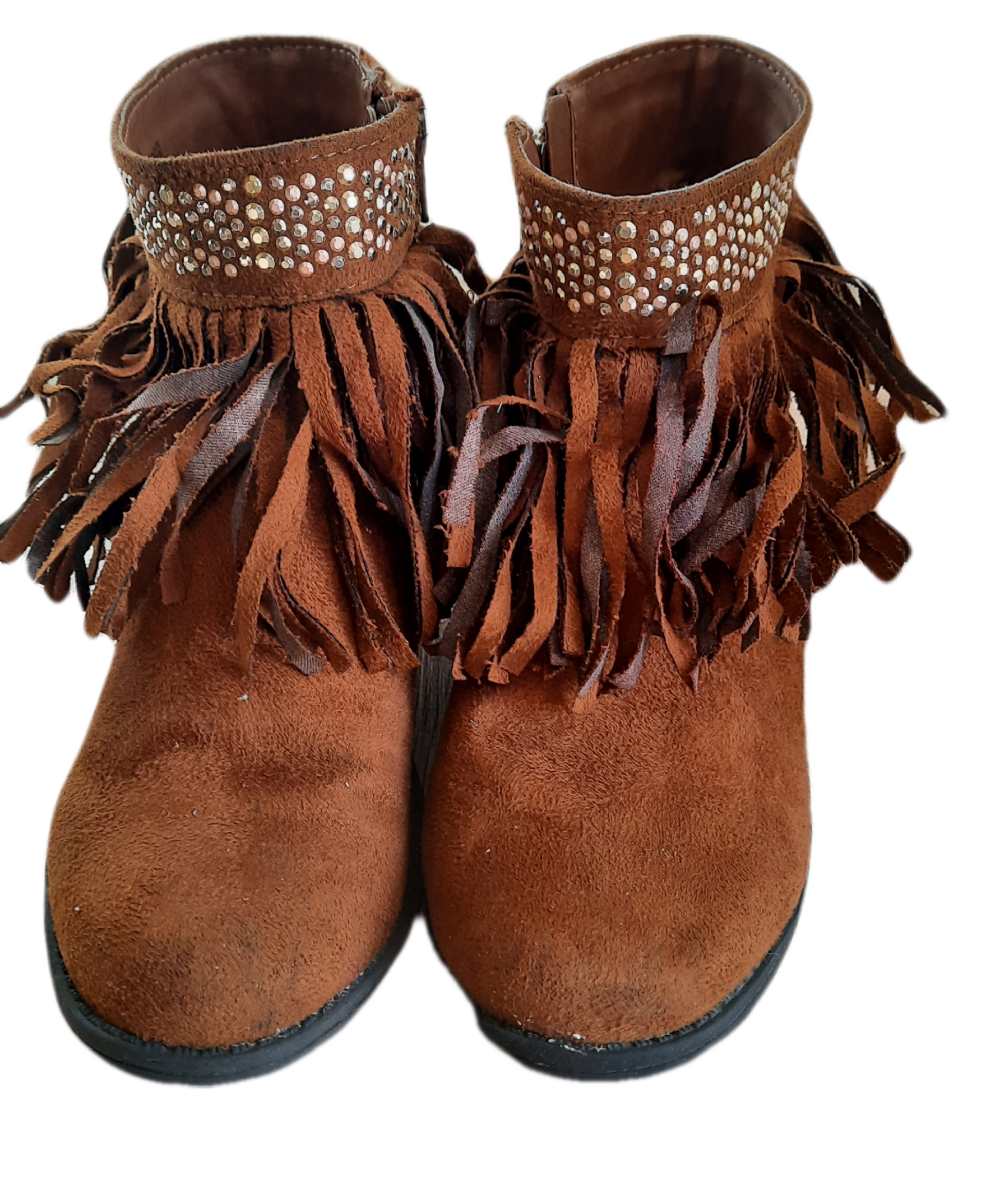 Gorgeous girl/kids pre owned cognac brown faux suede ankle boots with fringe. Size 1M girls shoe. All man made with shiny gold/silver toned studs around the top opening of the boots. Zipper on the instep of the boot. The heel measures 1.9 inches and the toe is rounded. Geat condition!!