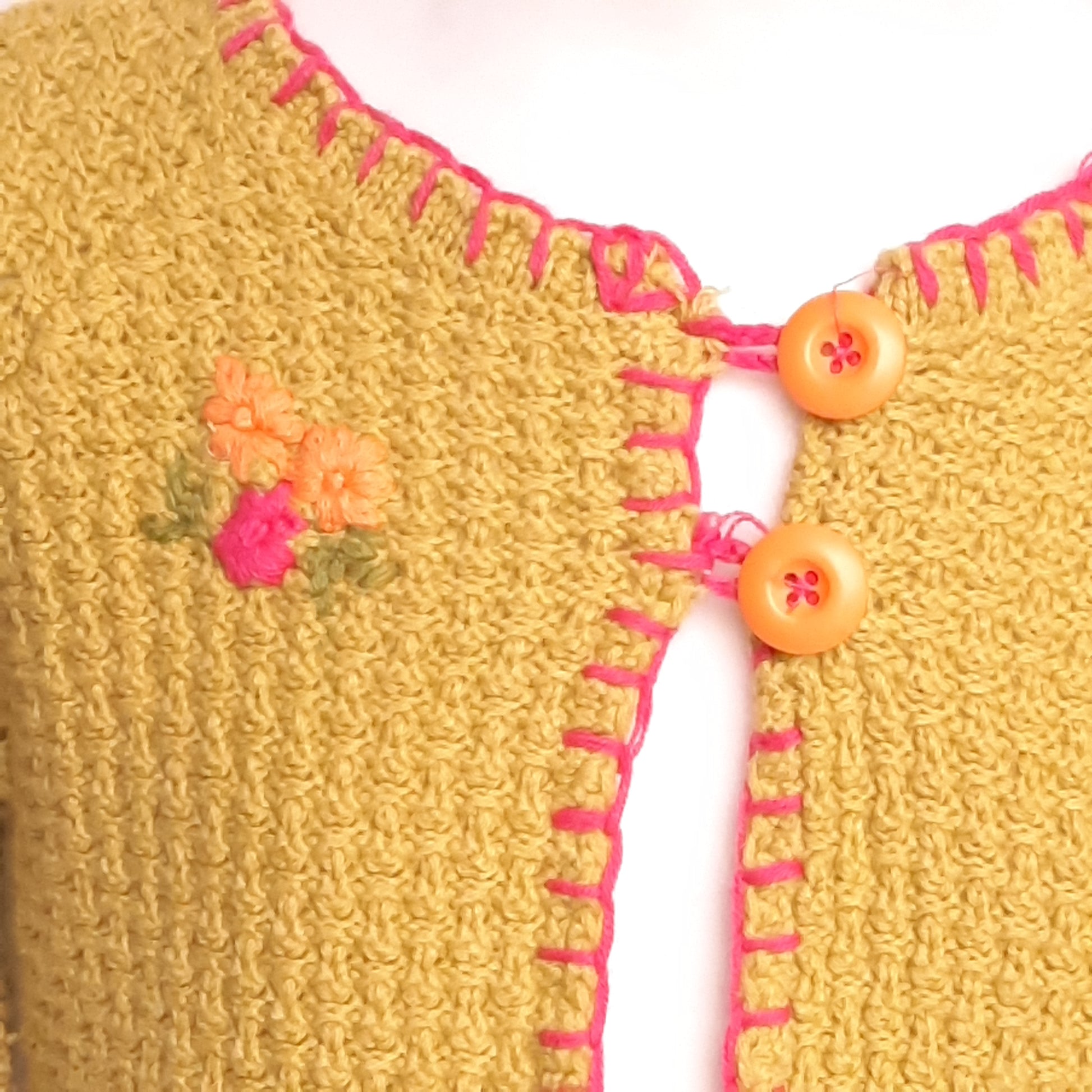 Beautiful new without tags girl's sweater by Chelsea's Corner. Chartruce green color with hand sewn pink threaded trim. Hand sewn orange and pink flowers sewn on to upper right side of sweater. Adorable hand sewn purse on the sweater is a pocket with an orange button and matching small buttons as the purse handle.80% cotton 40% Acrylic. Machine wash cold with like colors. Delicate cycle.