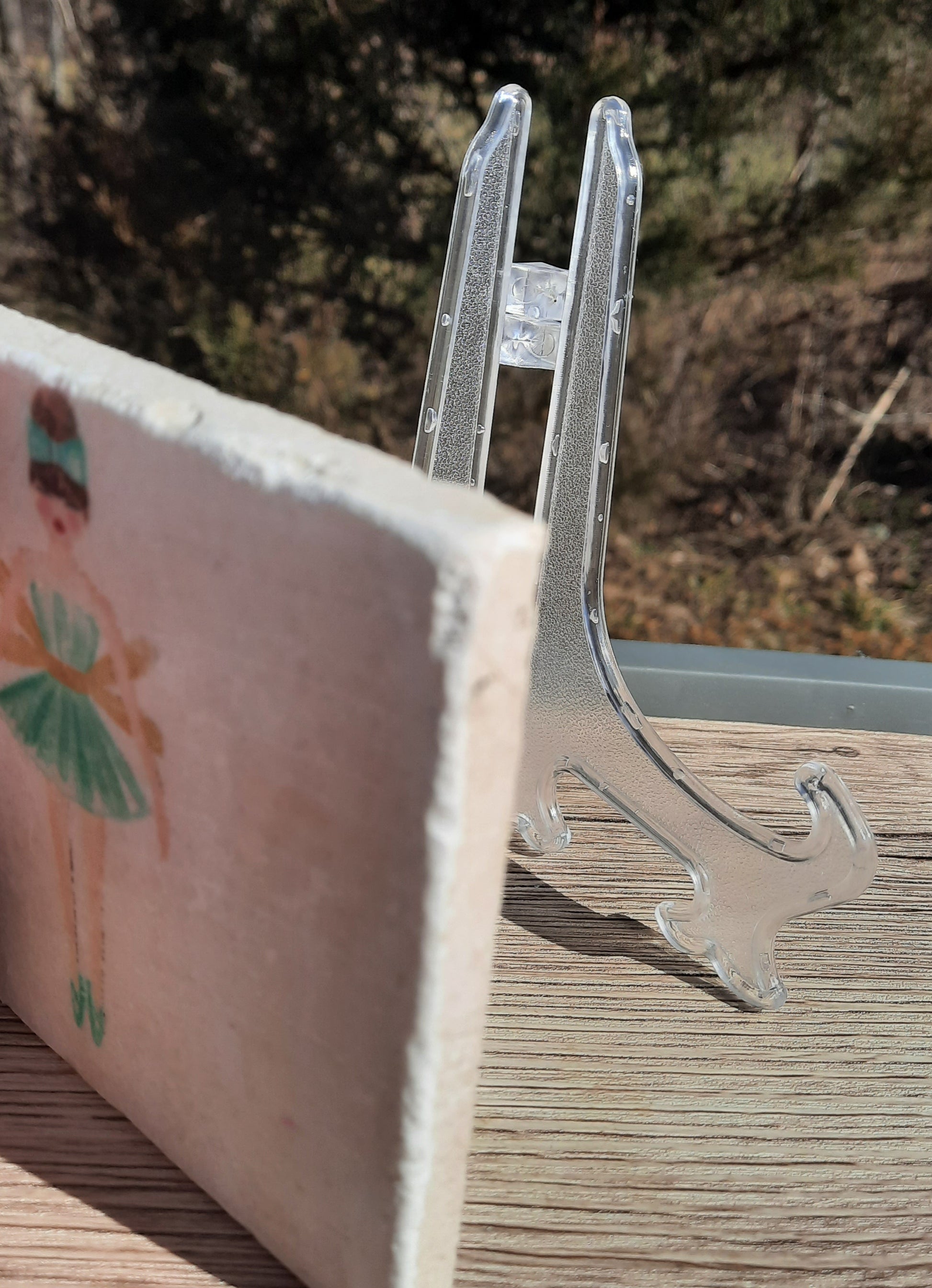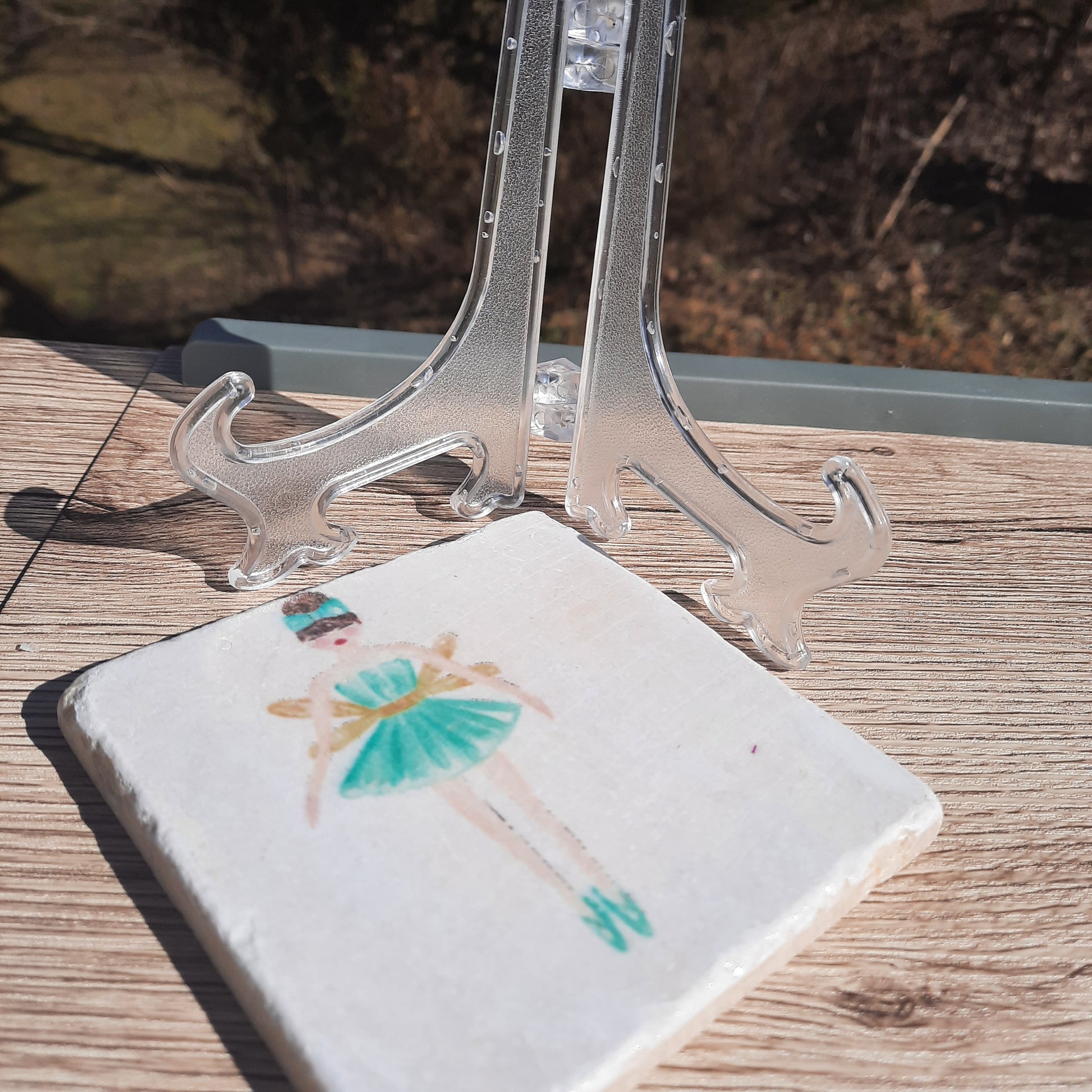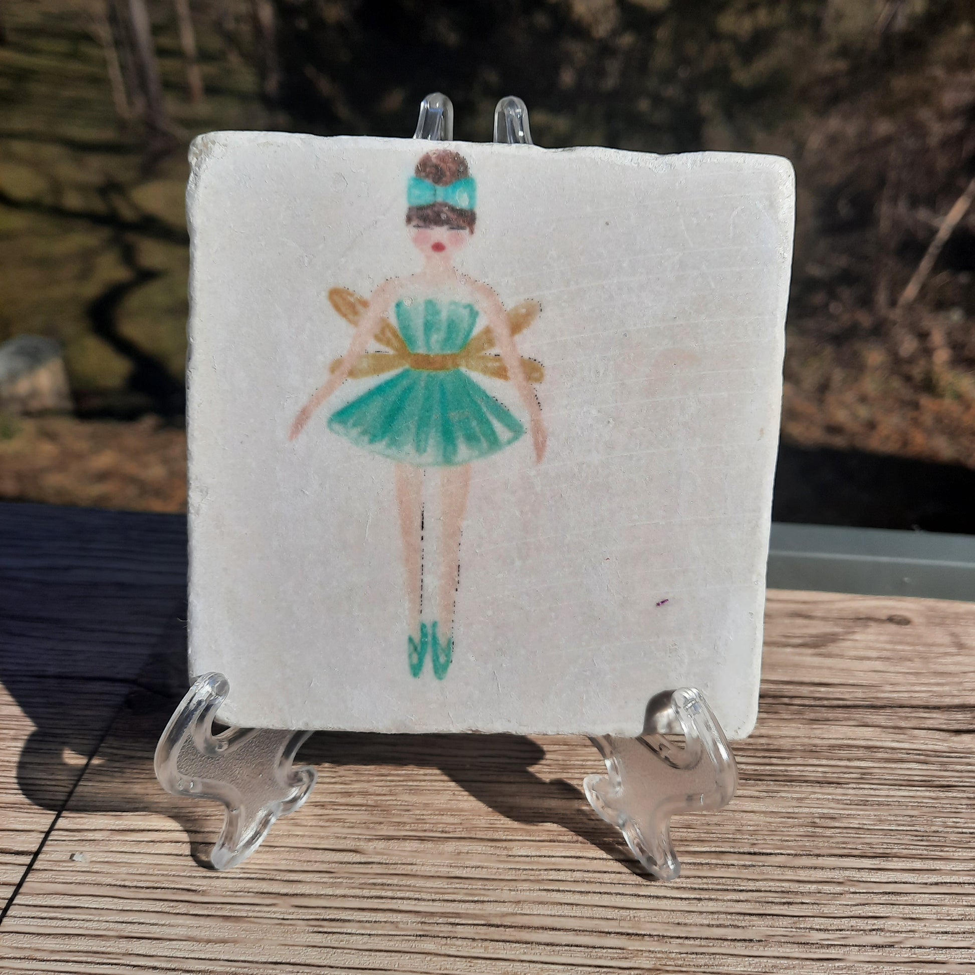 Hand crafted ceramic tiles with a Nutckracker Green fairy tutu image. Measures 4in x 4in. 1/4in. thickness. Comes with plastic easel which measures 5in tall and 5in. wide. Perfect gift for that ballerina in your life, child birthday, theater teacher gift, dance teacher gift or just a gift for yourself.